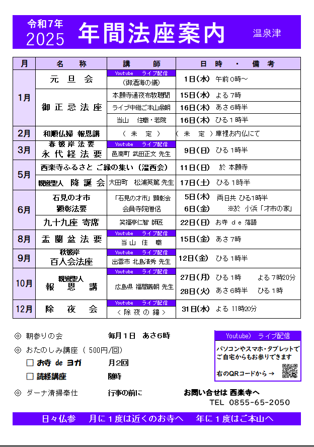 行事案内 (年間行事予定)gyoujiinfo 西楽寺では、法要・法座のほかに 各種イベント・行事があります。 修正会(元旦会) 百人会法座 温西会(おんさいかい) 夏休みおはよう会 報恩講法要 おたのしみ講座 九十九座寄席 2025(令和7)年 年間行事予定表 西楽寺情報 西楽寺情報 西楽寺概要 行事案内 西楽寺チャンネル 西楽寺いっしょ倶楽部 アルバム(ギャラリー) 縁の輪 永代経懇志 アクセス お問い合わせ